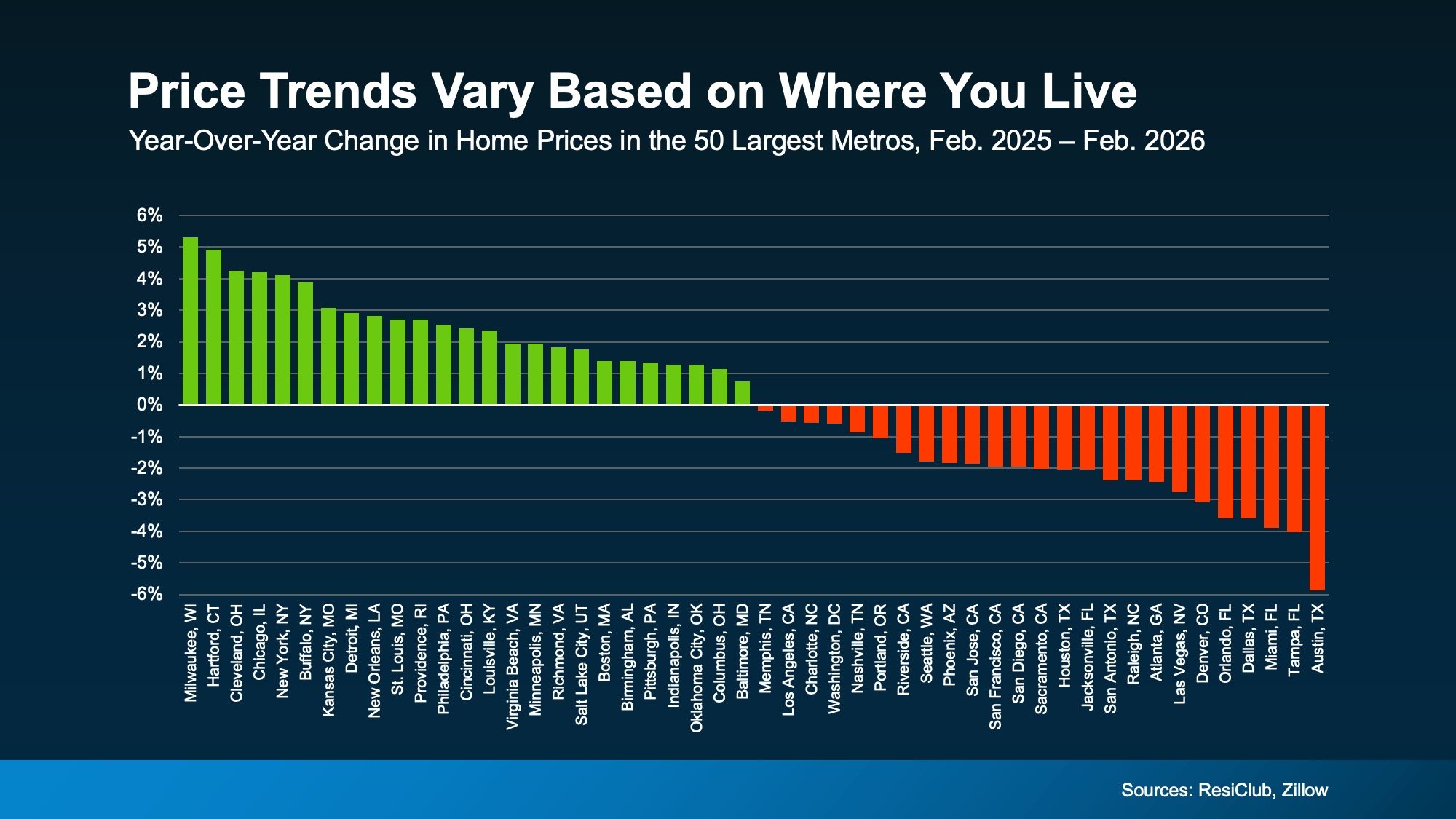The biggest thing feeding into the confusion online is how different home price trends are by area right now. Take a look at this data from ResiClub and Zillow (see graph below).