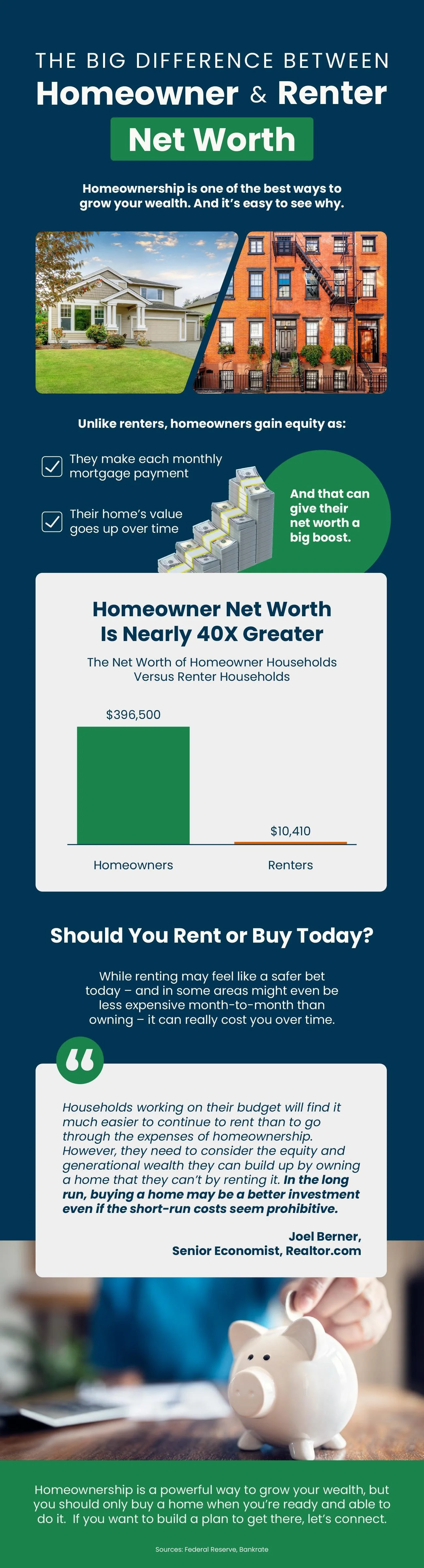 As you pay down your mortgage and as home values rise over time, you gain equity – and that helps grow your net worth. That’s why a homeowner’s net worth is nearly 40X greater than a renters.