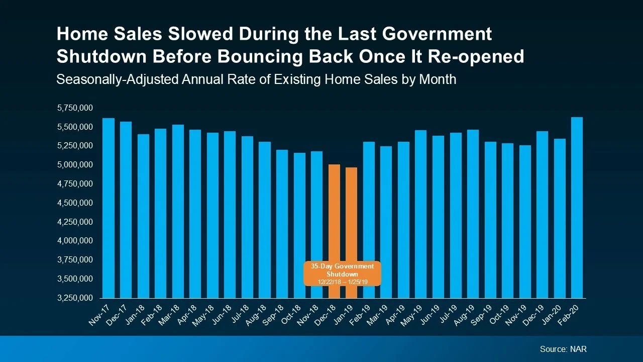 A government shutdown can cause short-term delays for some buyers, but it doesn’t derail the housing market. The last time this happened, sales picked back up as soon as the government re-opened.