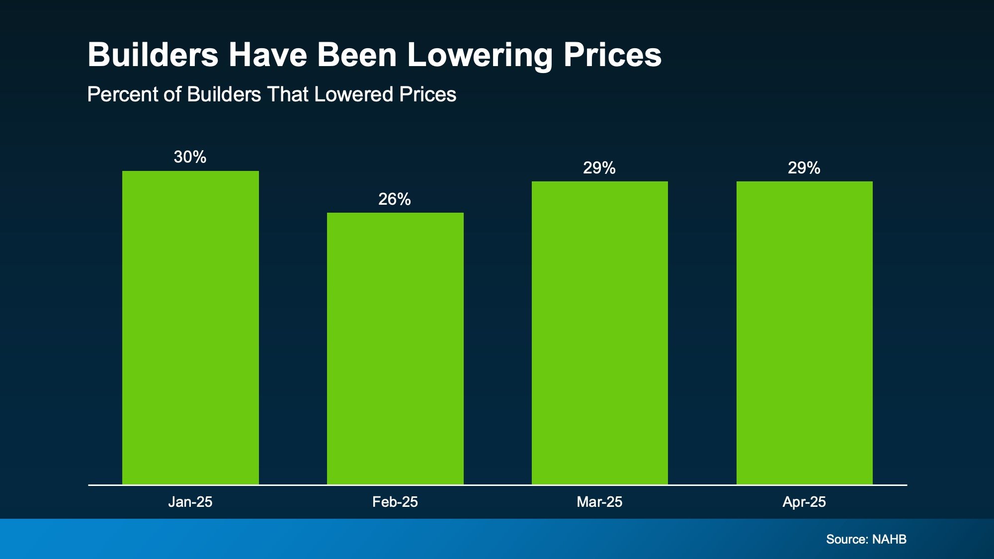 Around 30% of builders lowered prices in each of the first four months of the year. While that also means most builders aren’t lowering prices, it also shows some are willing to negotiate with buyers to get a deal done.