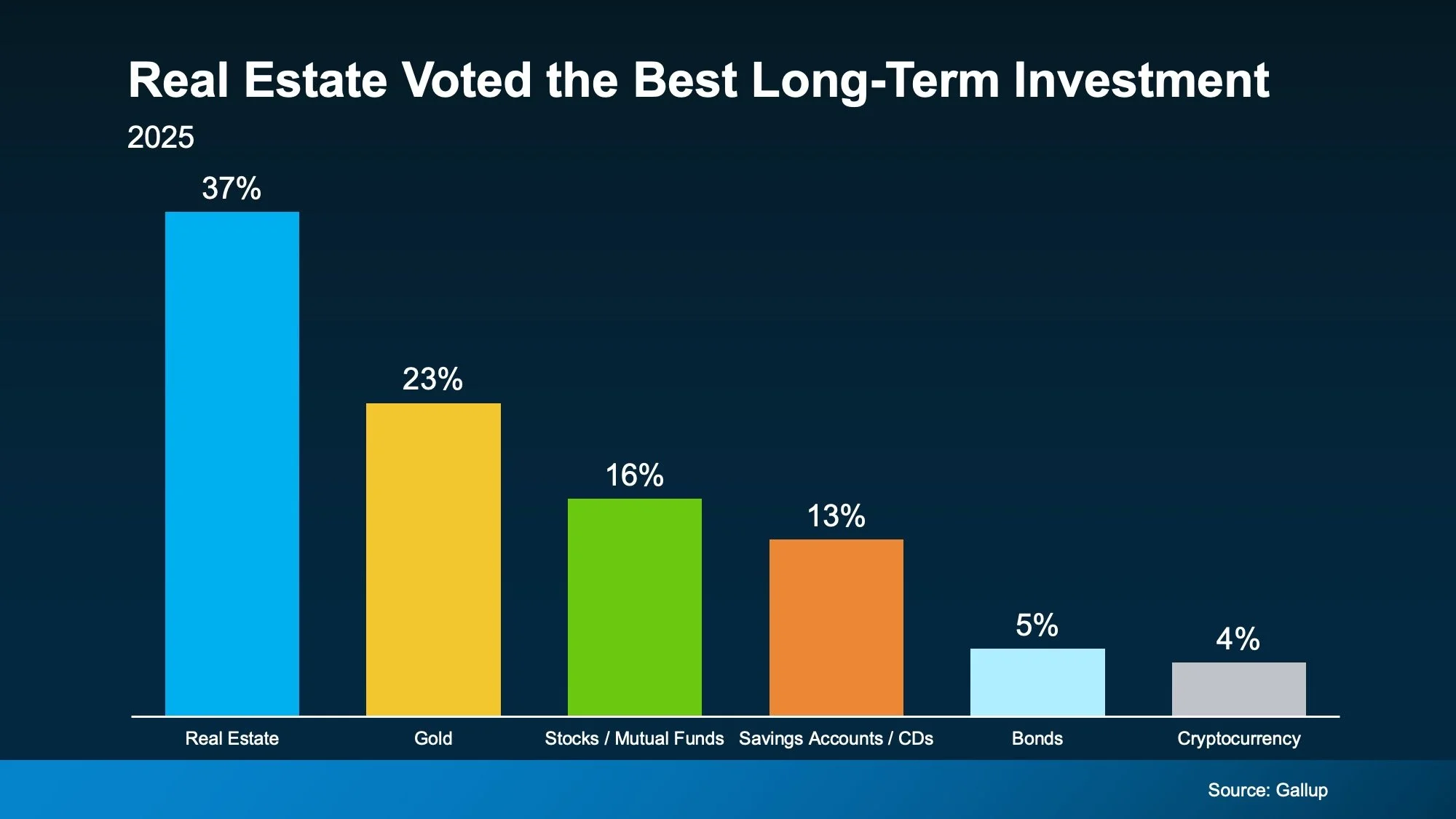 According to the just-released annual report from Gallup, real estate has been voted the best long-term investment for the 12th year in a row. That’s over a decade of beating out stocks, gold, and bonds as America’s top pick.